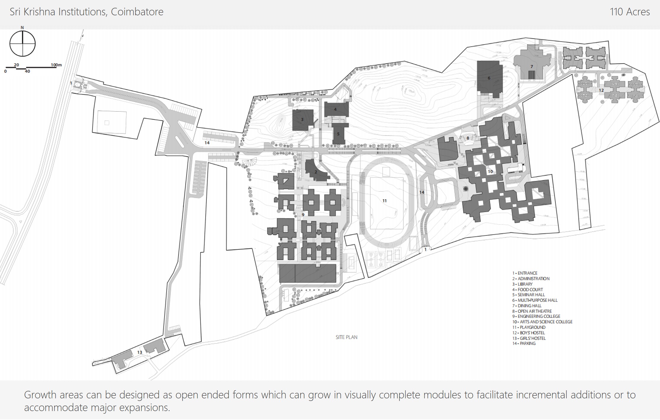Institutions grow with time and technology makes new demands on available facilities. Therefore, a campus plan cannot be conceived as an end state design, but should be a dynamic system that is expandable and upgradeable which will, at all times during its life cycle, appear aesthetically whole similar in character to a landscape where plants grow, multiply and mature together without appearing to be a work in progress.